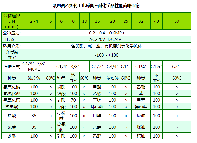 聚四氟乙烯化工電磁閥具有優(yōu)異的耐腐蝕性能,對所有的常用化學(xué)品都呈惰性。幾乎可以抵抗所有化學(xué)介質(zhì)(包括濃硫酸和王水)。具有優(yōu)異的耐熱性能,應(yīng)用溫度為-100~180℃,材料可長期在230~260℃下工作。特別適合腐蝕嚴(yán)重、溫度高且化學(xué)品不允許與潤滑劑接觸的環(huán)境。