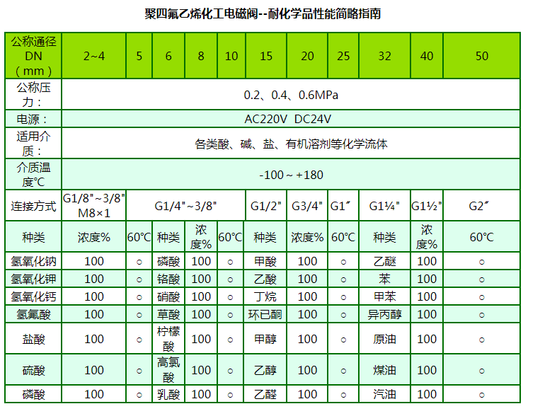 “禹成牌”化工電磁閥由于啟閉原理的獨特性和結構設計的科學性,產品的所有部件均可根據不同的化學介質選用不同的高分子材料制造,同時由于它的先導孔和卸壓孔是傳統閥的幾十倍大,復位彈簧設置在介質外,因此它具有不易堵塞、耐酸堿、抗腐蝕和使用壽命長等優點,可適應于各種化學流體介質,是化工流體自動化生產設備的最佳配套產品。